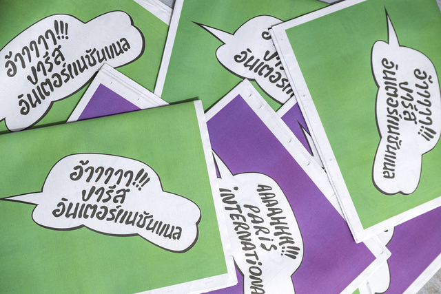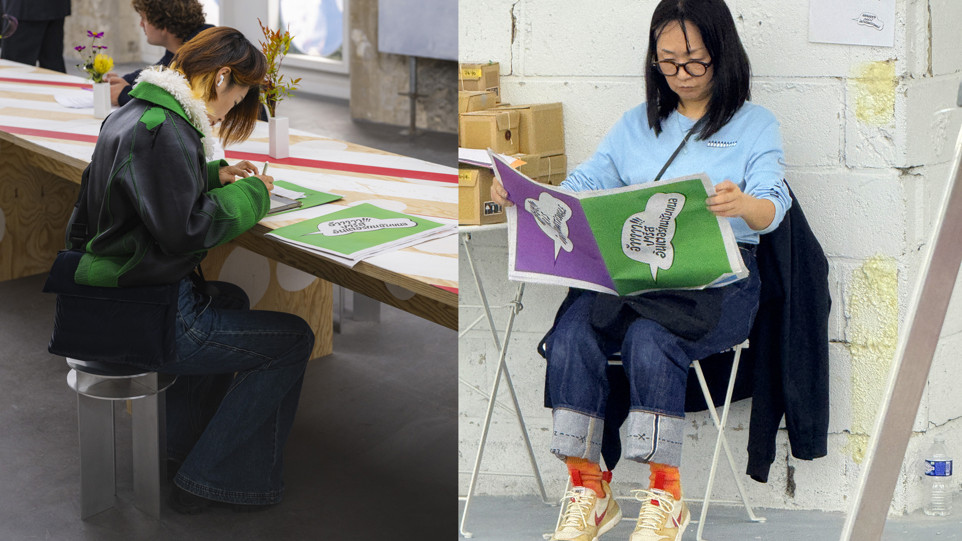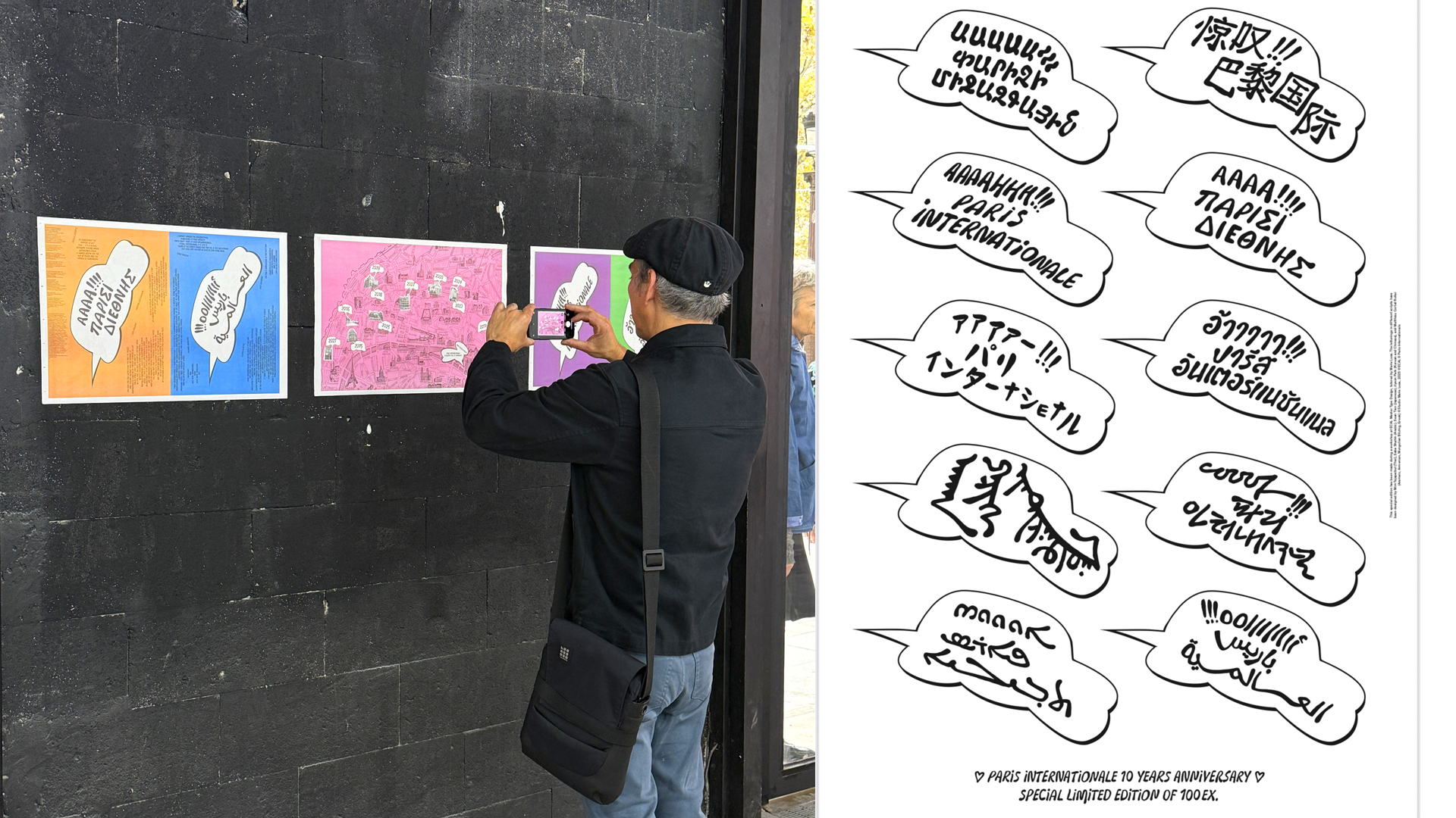 Paris Internationale 10 years publication has been made during a workshop session of at ECAL Master Type Design, tutored by Marie Lusa. Participants: Chae Ahn, Saliù Baldé, Claudio Bolzonello, Elena Calò, Meryem Fekhari, Julian Jaffé, Phil Kim, Dohee Lee, Jiyeon Park, Diego Steiner, Sean Tien, Yousef Saba and Friederike Wagner. The letterings in different scripts have been designed by Mim Tejapaibul (Thai), Saba Yousef (Arabic), Sean Tien (Japanese), Jiyeon Park (Korean and Chinese), and Matthieu Cortat Roller (Aramaic, Armenian, Mongolian Bitchig, Greek). All the display typefaces used in this publication have been designed by the students. The font used for smaller texts is Parabole, designed by Dávid Molnár and updated by Chandra Sperle.