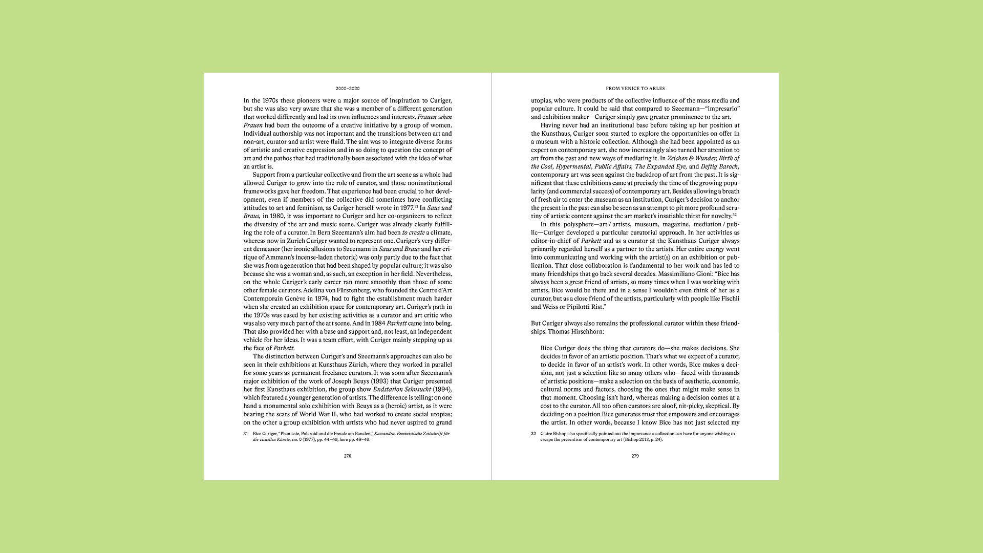 C IS FOR CURATOR: BICE CURIGER - A LIFE IN ART. Edited by Dora Imhof. Contributions by Katharina Fritsch, Kathy Halbreich, Thomas Hirschhorn, Massimiliano Gioni, Dora Imhof, Hans Ulrich Obrist, Nicholas Serota an Philip Ursprung. Walther Koenig, Cologne 2022. 18,5 x 25,8 cm. 404 pages with 209 (80 coloured) pictures. Edition Patrick Frey